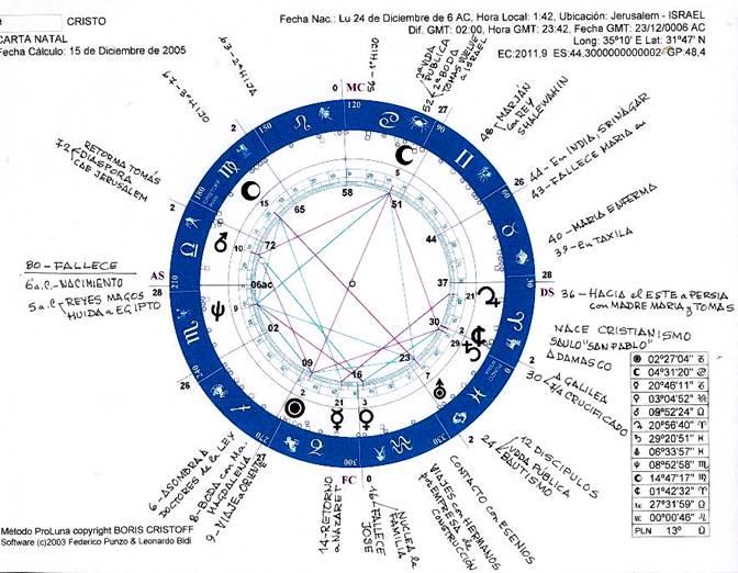 Para que se compruebe la sincronización de PROLUNA entre símbolos y sucesos biográficos, este es el resumen biográfico de mi libro “LAS TRES VIDAS DE CRISTO” en página 169. Es el primer texto para ejercitarse en PROLUNA (carta natal, pag. 11 ), RESONA (cartas anuales pag 15, 67, 207 y 208), RELUNA (carta mensual ) y REDIANA (cartas diarias pags. 69, 75, 87 y 96) Para la interpretación de PROLUNA ver el libro PROLUNA en info@kier.com.ar
