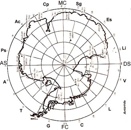 contorno de la Antártida. El punto central del círculo es el polo sur. Hay 24