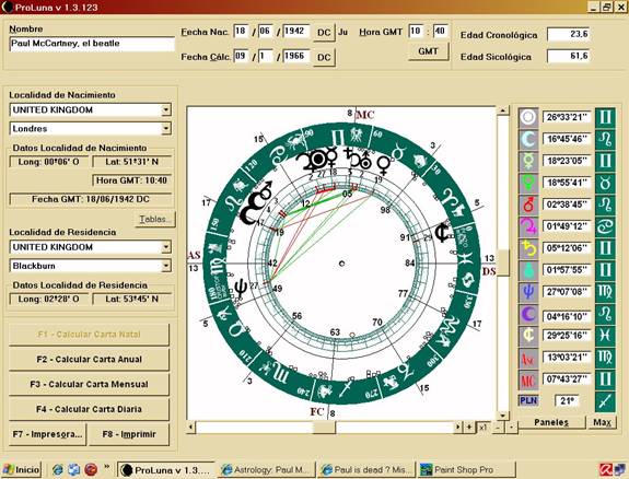 Paul nació el 18 de junio de 1942 a las 10h40 GMT en Londres. Su sol en 27º de Géminis lo define como apto en relaciones públicas y sociales, muy maleable y cambiante, de doble o múltiple personalidad, capacitado para adaptarse a cualquier circunstancia. Quiso el destino que además tuvo hasta un sosías. Su signo ascendente es 13º Virgo que corresponde a esos rasgos faciales finos que he destacado antes.