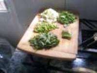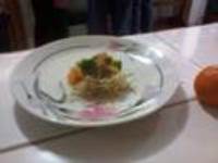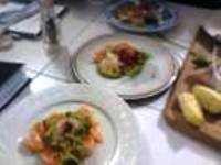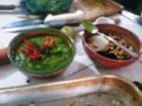 mango, pesto, ensalada de mango verde, salsa de mani y tamarindo.